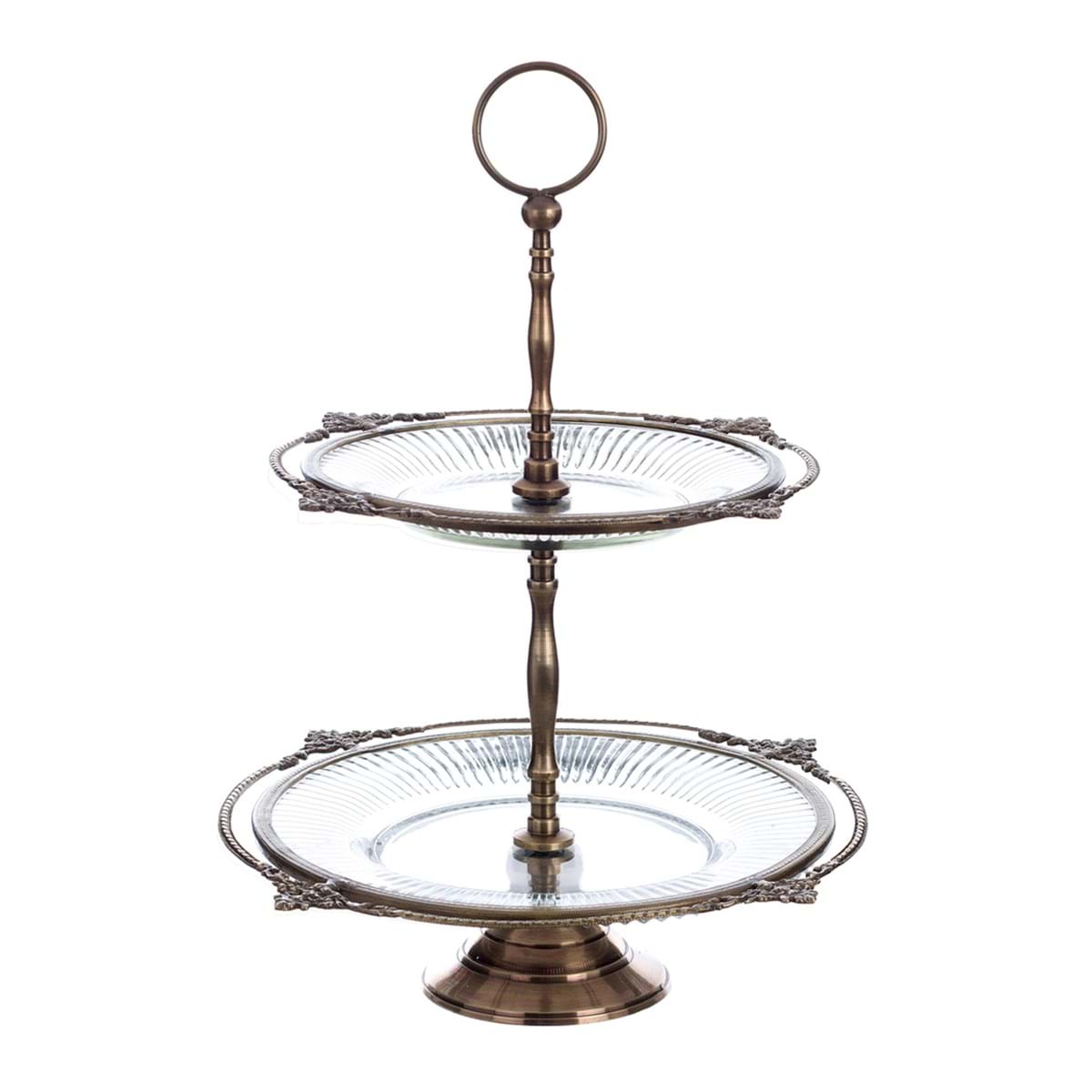 Elegante alzata a due ripiani, in ottone e vetro