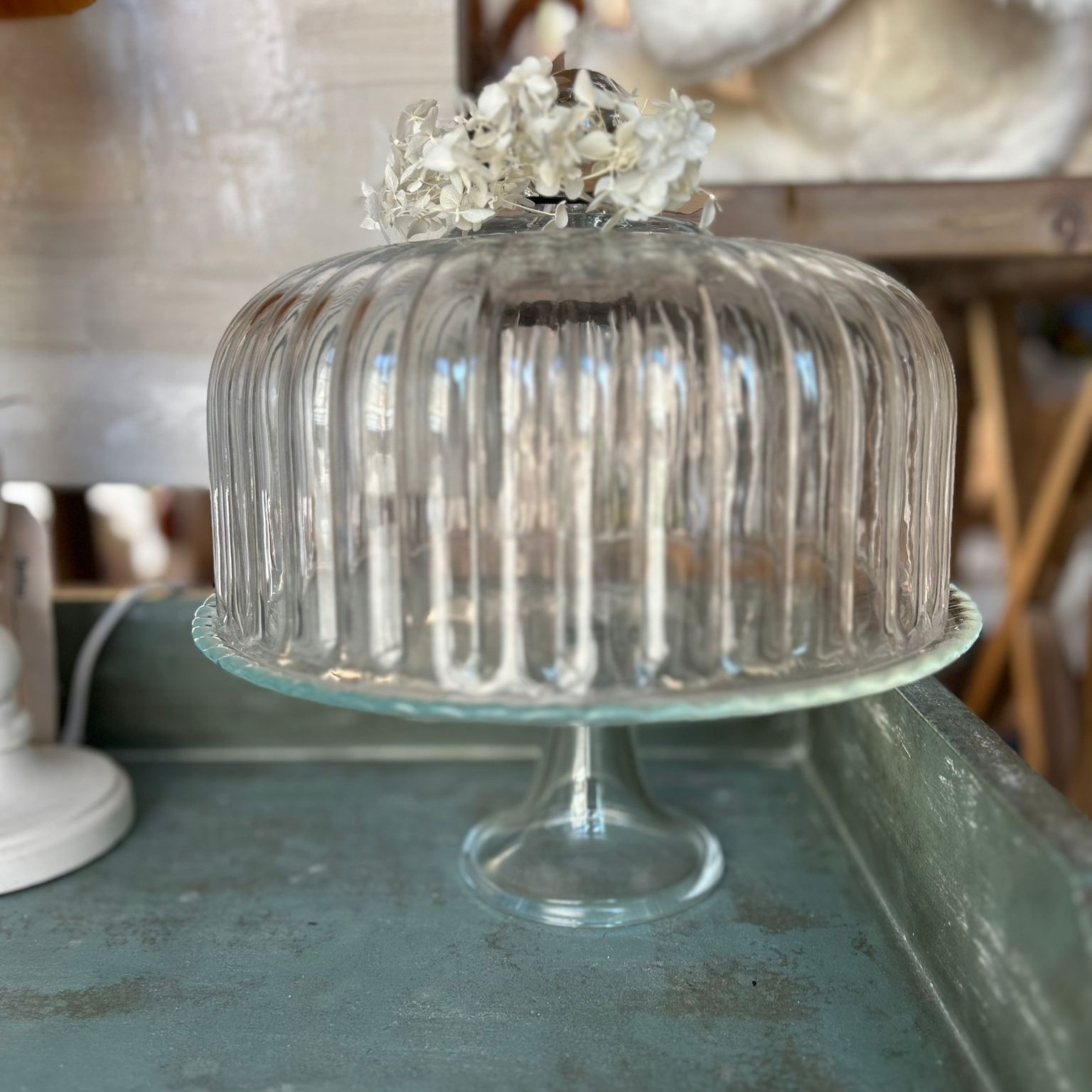 Realizzata interamente in vetro, si distingue per la sua cupola lavorata con finitura rigata, che dona un effetto elegante e scenografico, perfetto per ambienti shabby chic e classici. La base con piede slanciato valorizza la presentazione, rendendo ogni creazione protagonista della tavola.