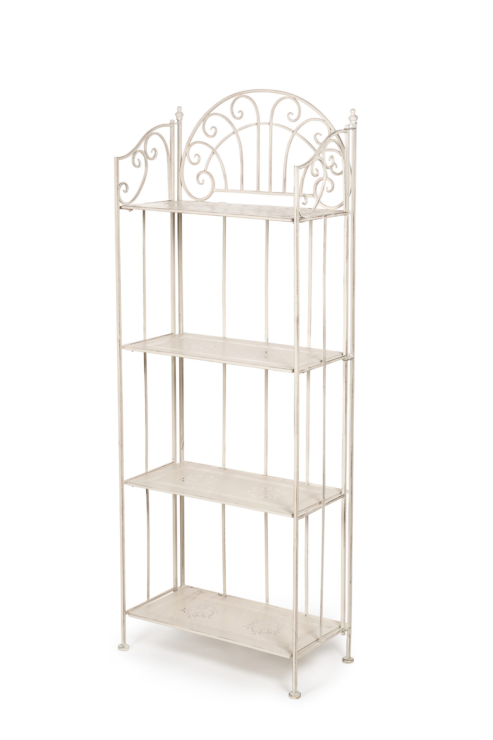 La struttura in metallo con finitura dal gusto shabby chic è impreziosita da raffinati decori intrecciati nella parte superiore, che donano leggerezza e charme senza tempo. I quattro ripiani offrono ampio spazio per libri, oggetti decorativi, candele o piccoli complementi, rendendola ideale per soggiorno, ingresso o camera da letto.