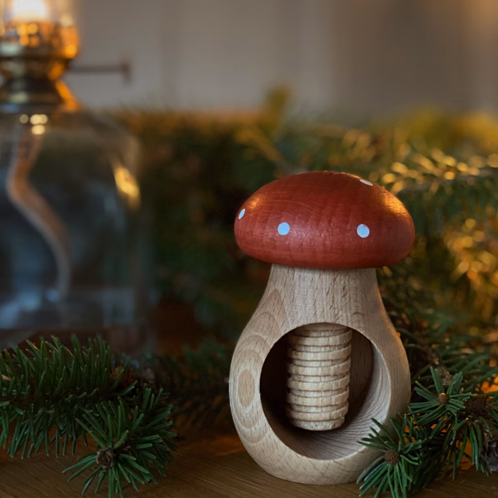 Schiaccianoci in legno a forma di fungo. Realizzato in legno di faggio certificato FSC.