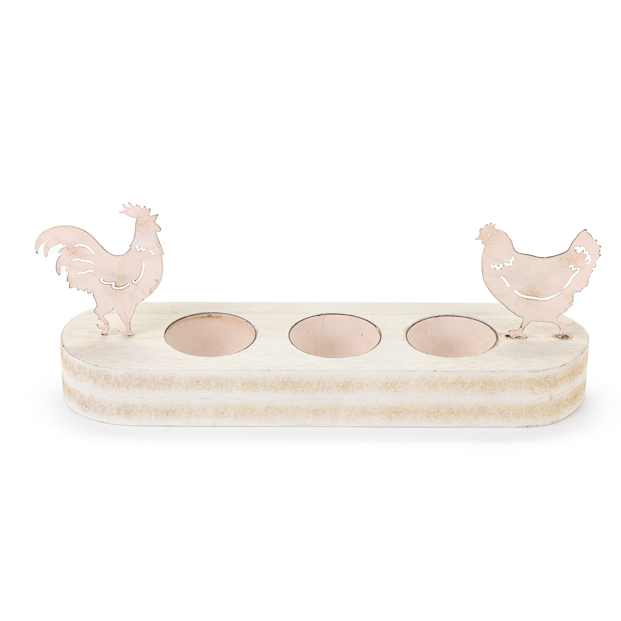 Un accessorio dal gusto country romantico, perfetto per decorare la tavola con un tocco originale. Il portauova firmato Nuvole di Stoffa è realizzato con finitura effetto anticata e arricchito da sagome decorative laterali a forma di gallo e gallina, che richiamano atmosfere rustiche e accoglienti.