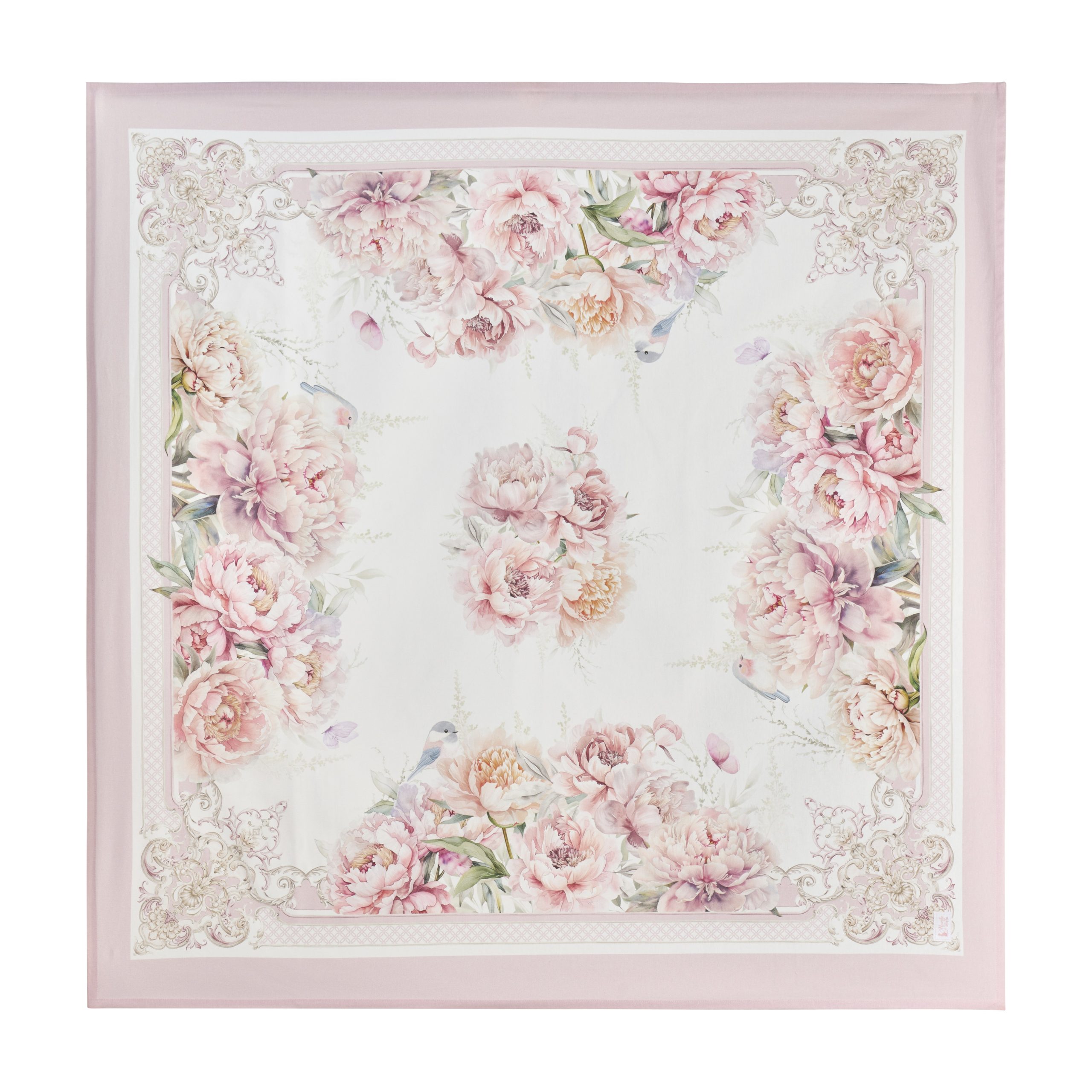 La raffinata stampa floreale con grandi peonie nei toni rosa cipria e pesca, unita ai dettagli ornamentali classici e al bordo rosa, dona alla tavola un’atmosfera romantica e luminosa in pieno stile shabby chic.