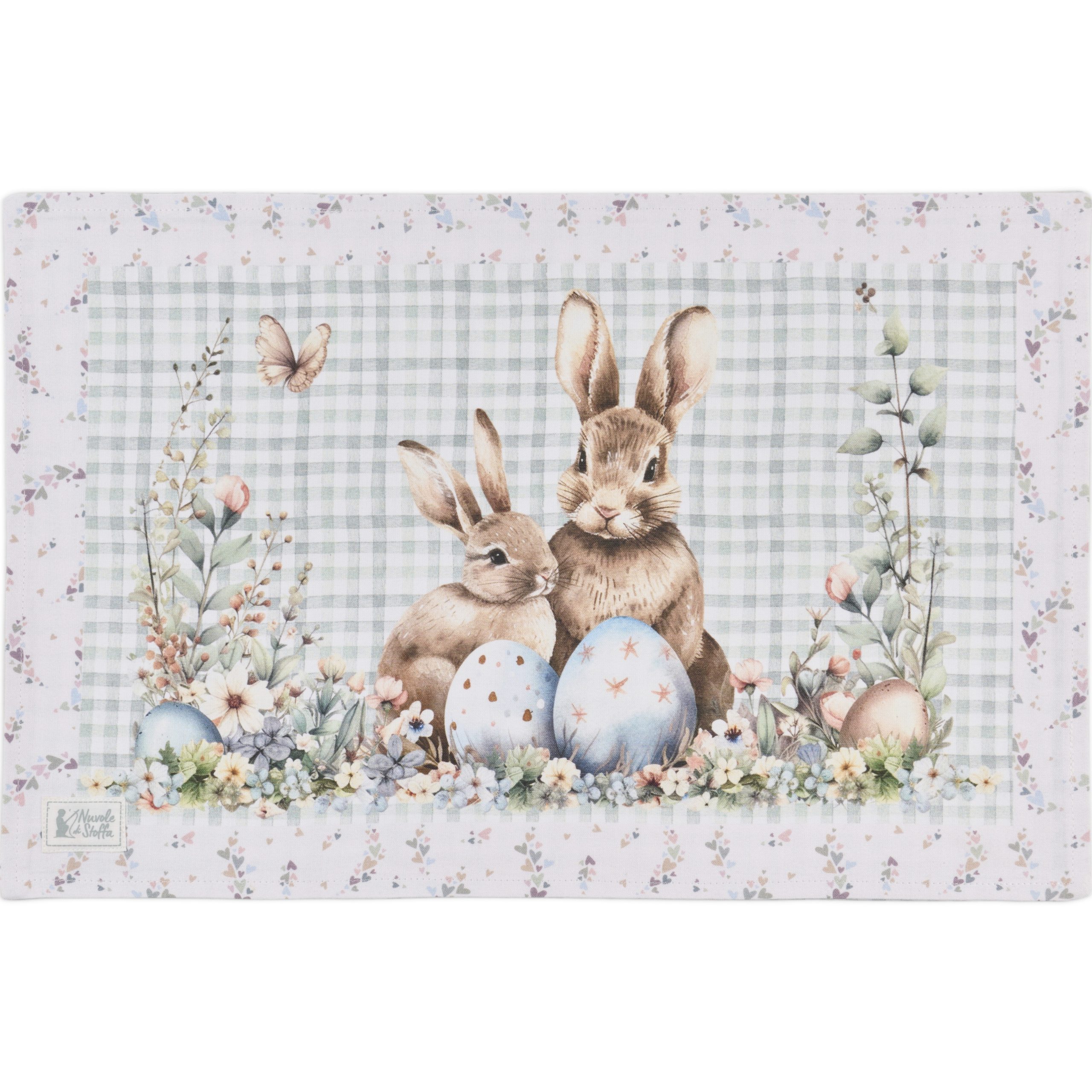 Questa tovaglietta americana firmata Nuvole di Stoffa porta in casa tutta la dolcezza della primavera: i teneri coniglietti tra fiori delicati e uova dai colori pastello creano un’atmosfera romantica e accogliente, perfetta per la colazione, il brunch o una tavola curata nei minimi dettagli.